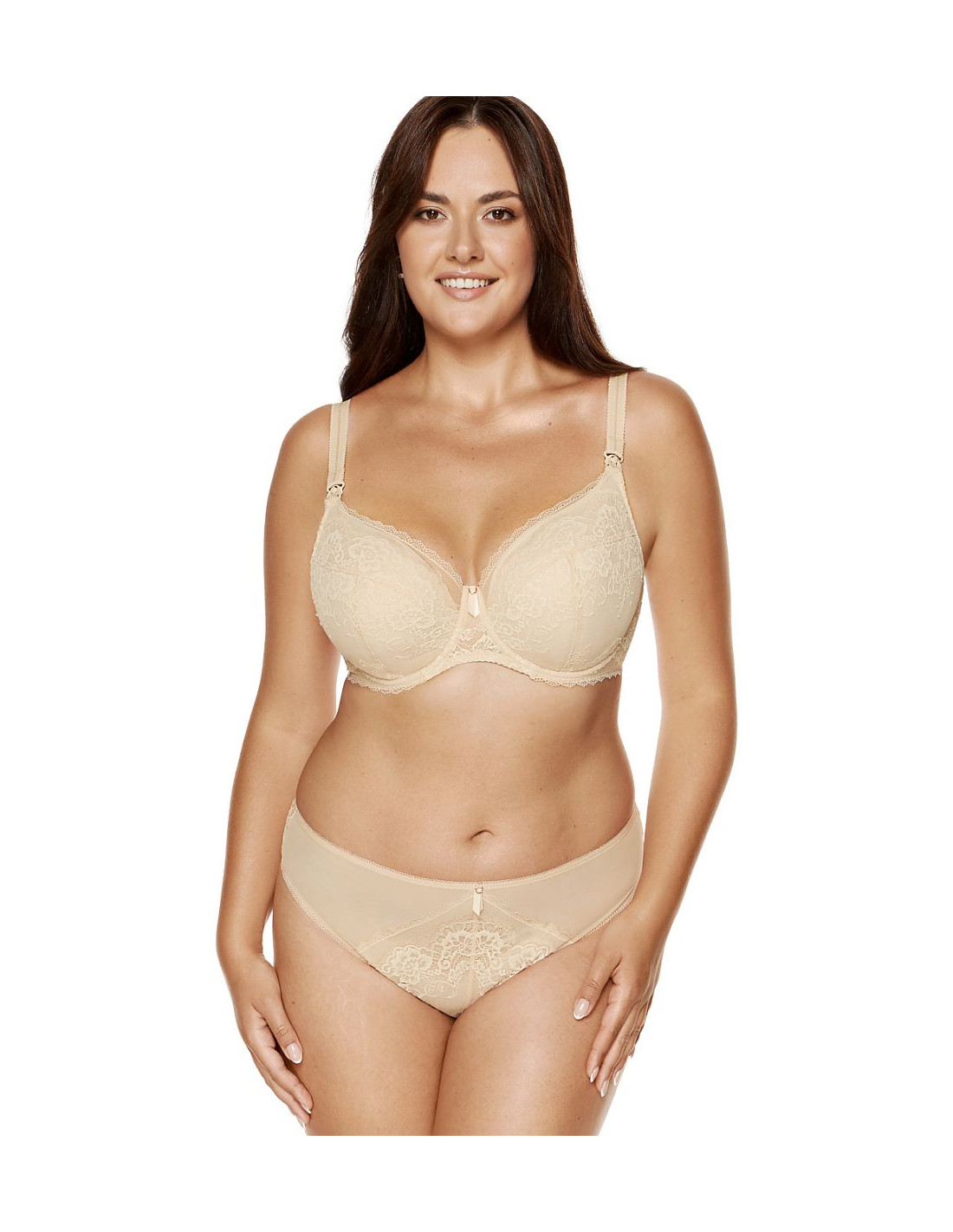 Soutien-gorge d'allaitement renforcé en dentelle. Possibilité de détacher et d'attacher confortablement les bonnets. Pochettes spéciales pour les coussinets d'allaitement. L'intérieur des bonnets est recouvert de coton avec la norme OEKO-TEX, ce qui les rend doux pour la peau. Les baleines verticales sur les côtés stabilisent le tour de poitrine. Le dos est fait de tulle et de dentelle. Le soutien-gorge a été conçu et fabriqué en Pologne.